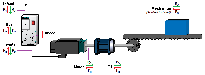 The diagram below illustrates the specific location for each component's power flow - Output Power (Po) and Regen Power (Pr). Note that the Mechanism power is the power applied to the Load. This is also refered to as the "Load Power". The equivalent for a servo pump is the Hydraulic Power (QxP).